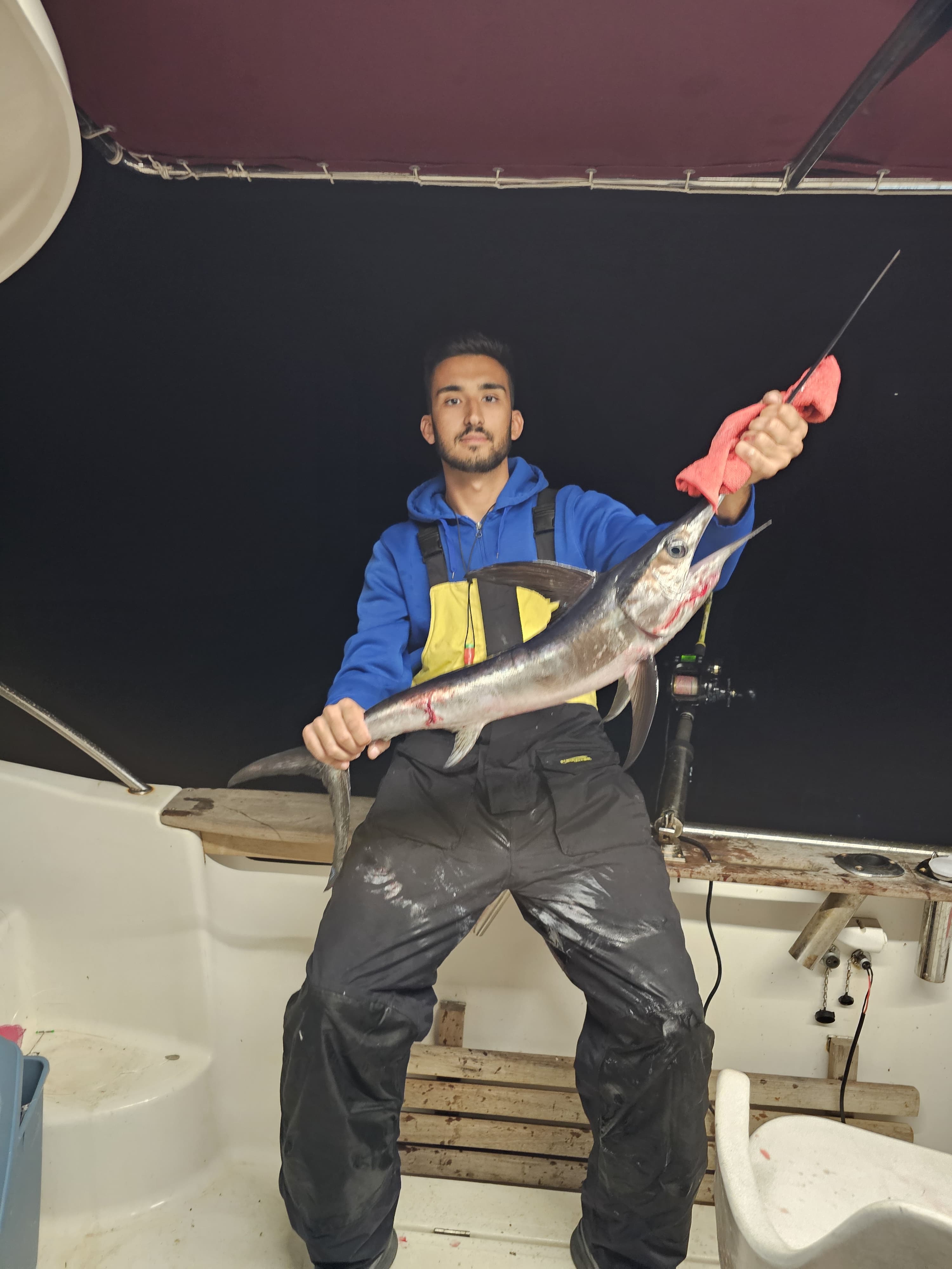 We throw pieces of sardines into the sea as bait, releasing blood that attracts predators. At the same time, we monitor the activity on the fishfinder, allowing us to see in real time whether a fish is approaching the boat.