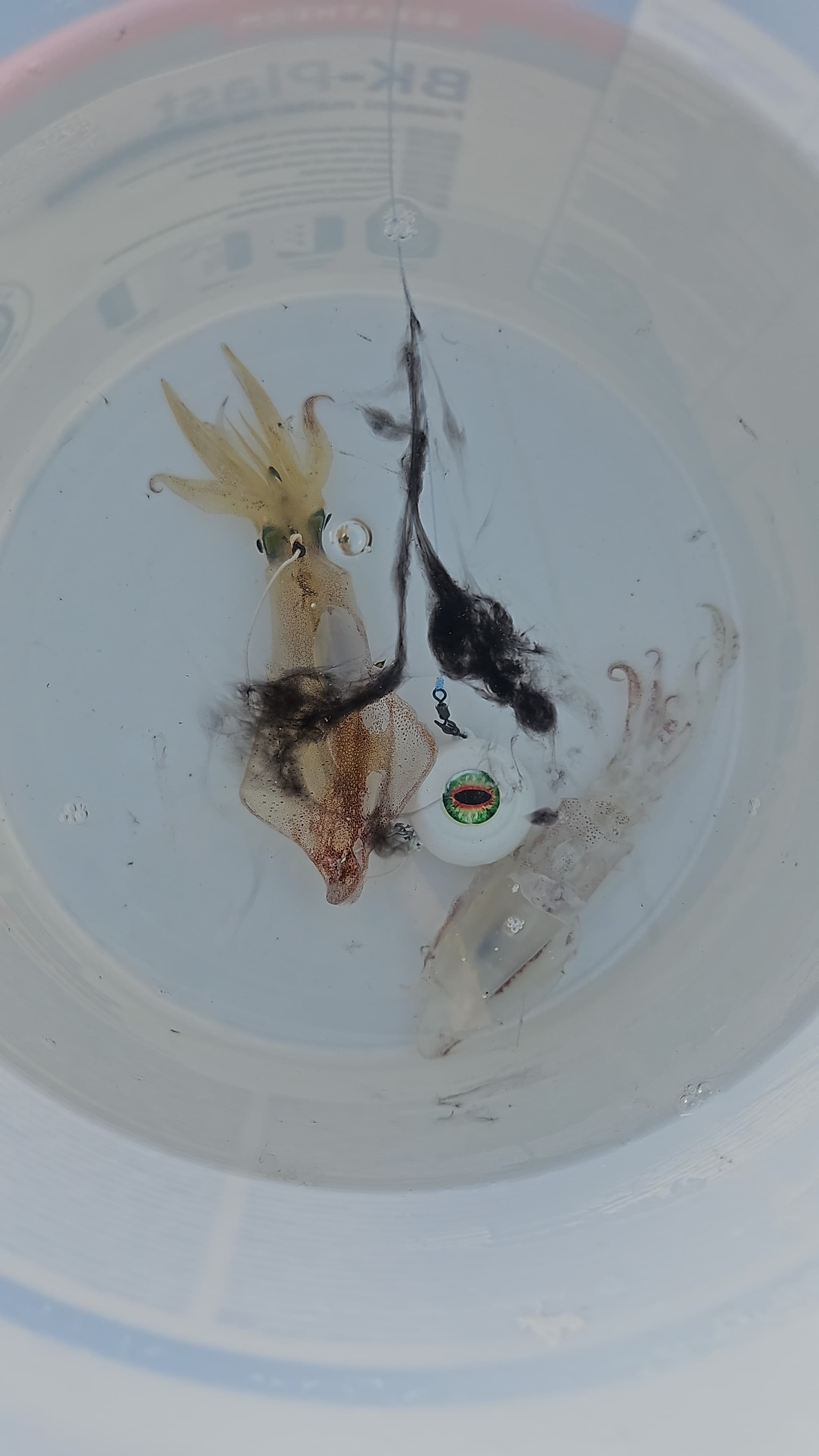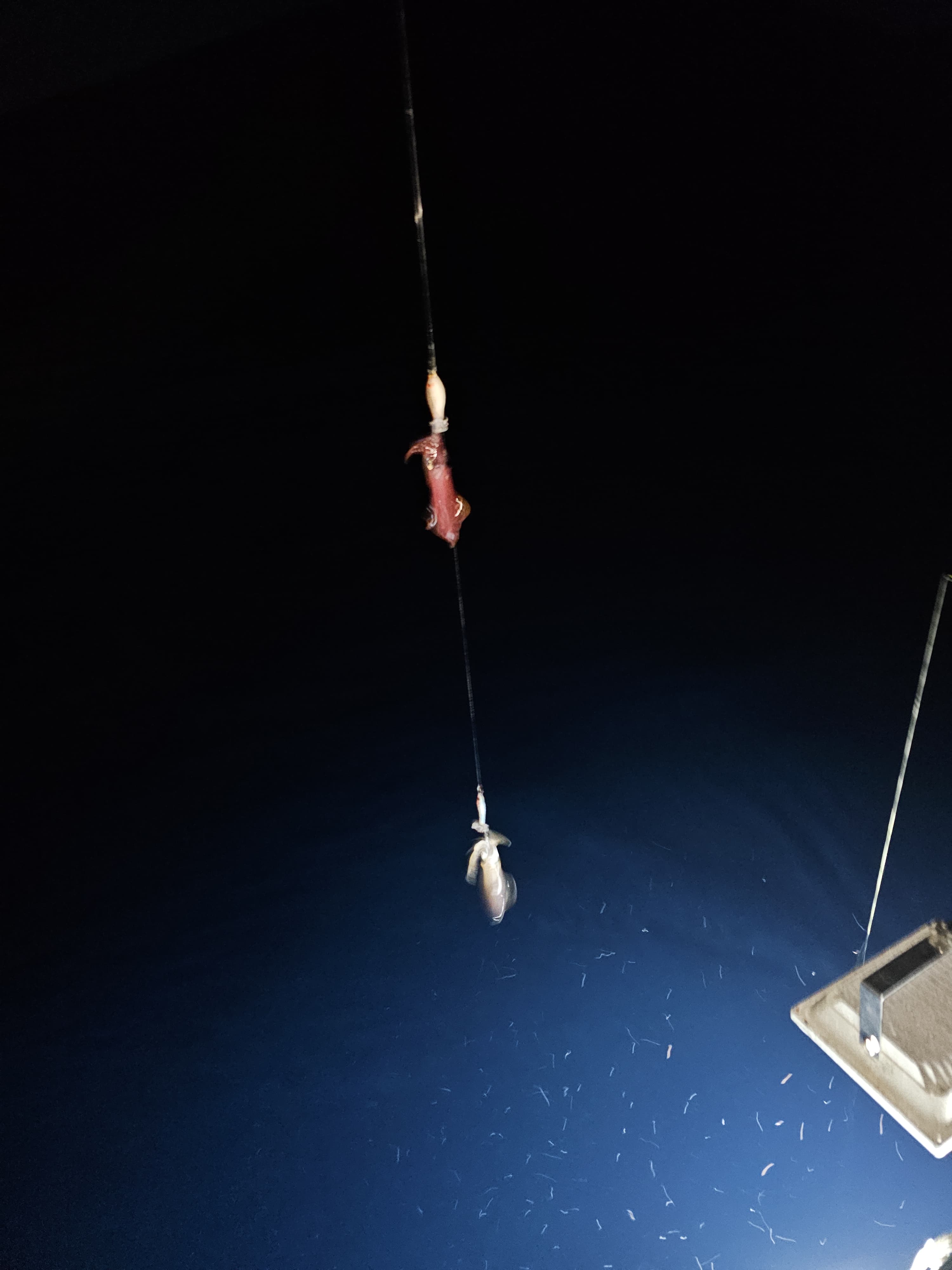 For squid fishing, we use artificial lures that closely resemble the fish and plankton found beneath the boat and near the bottom.